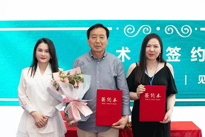 签约现场:艺术家张殷实(左)、艺博会饶佳(中)、见证企业家陈星好(右)